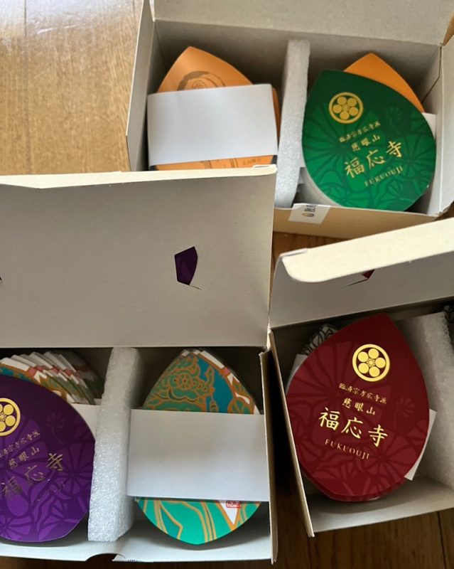 表面はご本尊様・北向観音様・天井画の龍(今年度末までに完成予定)、裏面は背景に壁画の蓮をデザインし箔押しで福応寺の紋や寺名等を印刷していただきました。
